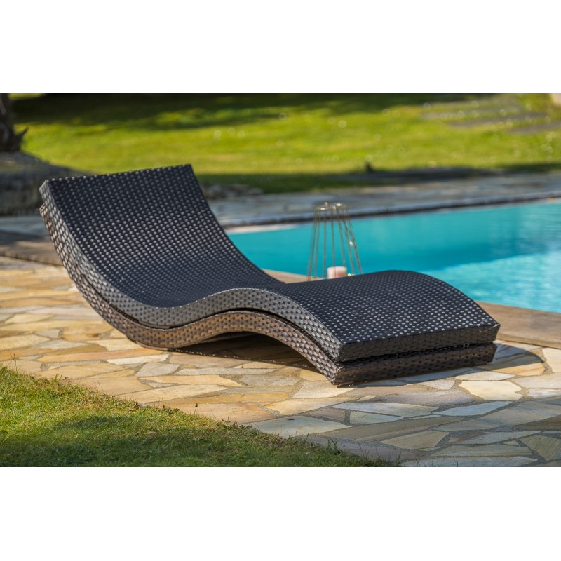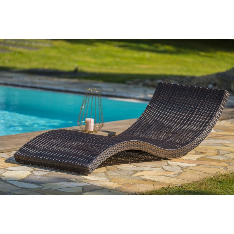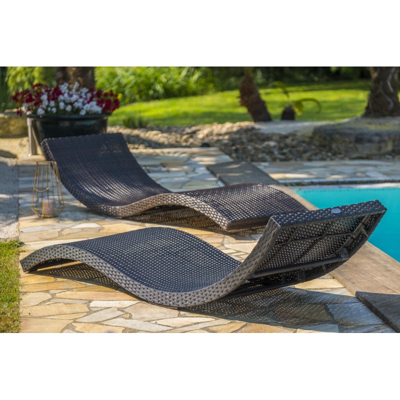 Le bain de soleil CANCUN en résine tressée chocolat et structure aluminium, empilable et ultra-léger, permet d’aménager le jardin en toute simplicité.