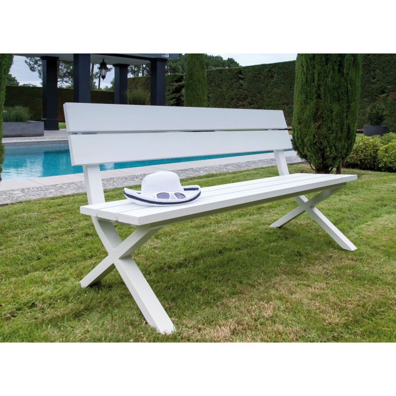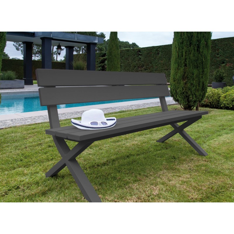 Un banc au design contemporain avec piétement en croix, idéal pour apporter style et convivialité à vos espaces extérieurs.