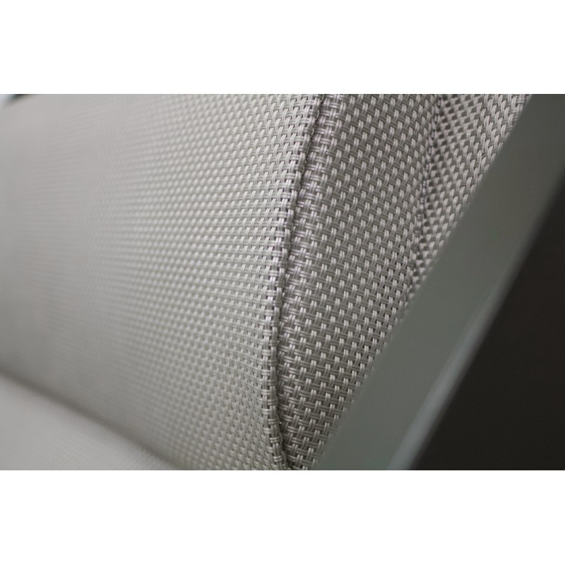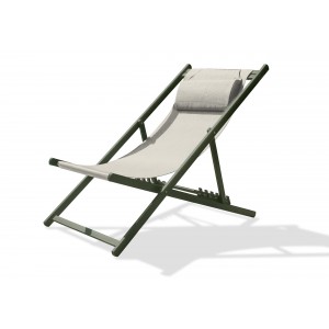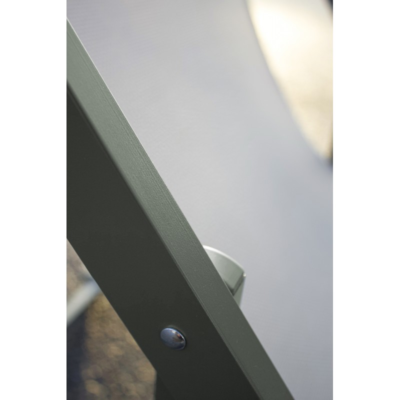 La chilienne JULIA en aluminium kaki et textilène gris est réglable sur 5 positions. Sa têtière assure repos et confort.