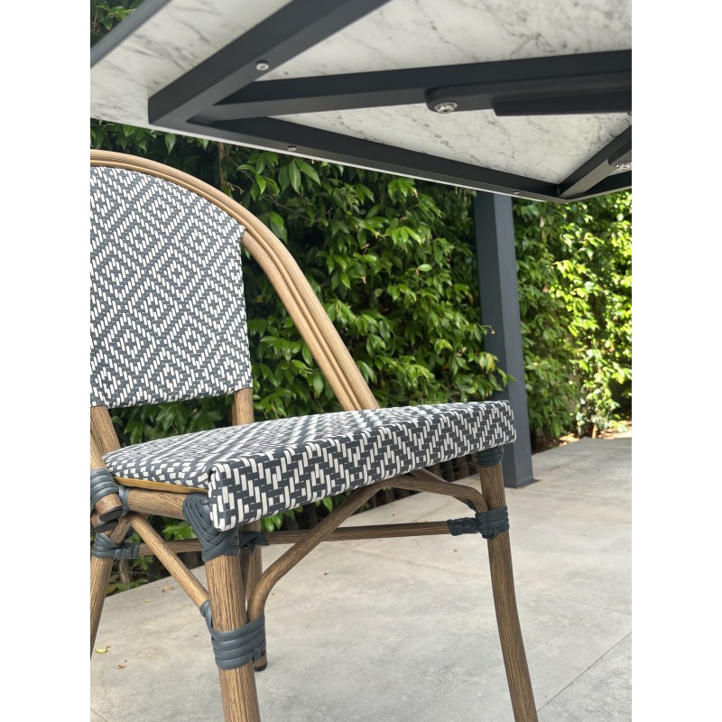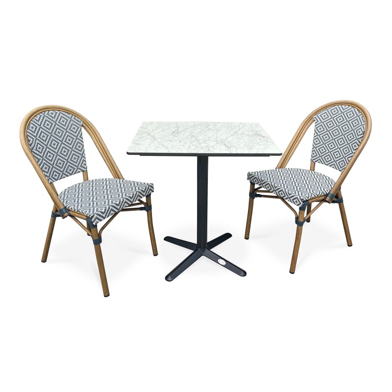 Idéale pour les petits espaces extérieurs comme pour accueillir des clients dans un restaurant, la table de jardin BISTRO en acier se glisse partout et accueille jusqu’à 2 personnes. Stable et robuste, elle mêle un style bistro chic qui vous charmera, grâce notamment à son élégant plateau en HPL aspect marbre blanc.Élégant et résistant, le fauteuil de jardin BISTRO en aluminium aspect bois a un style totalement intemporel. A la fois léger et empilable, il est très pratique pour les terrasses extérieures. Son assise et son dossier en textilène sont très confortables.