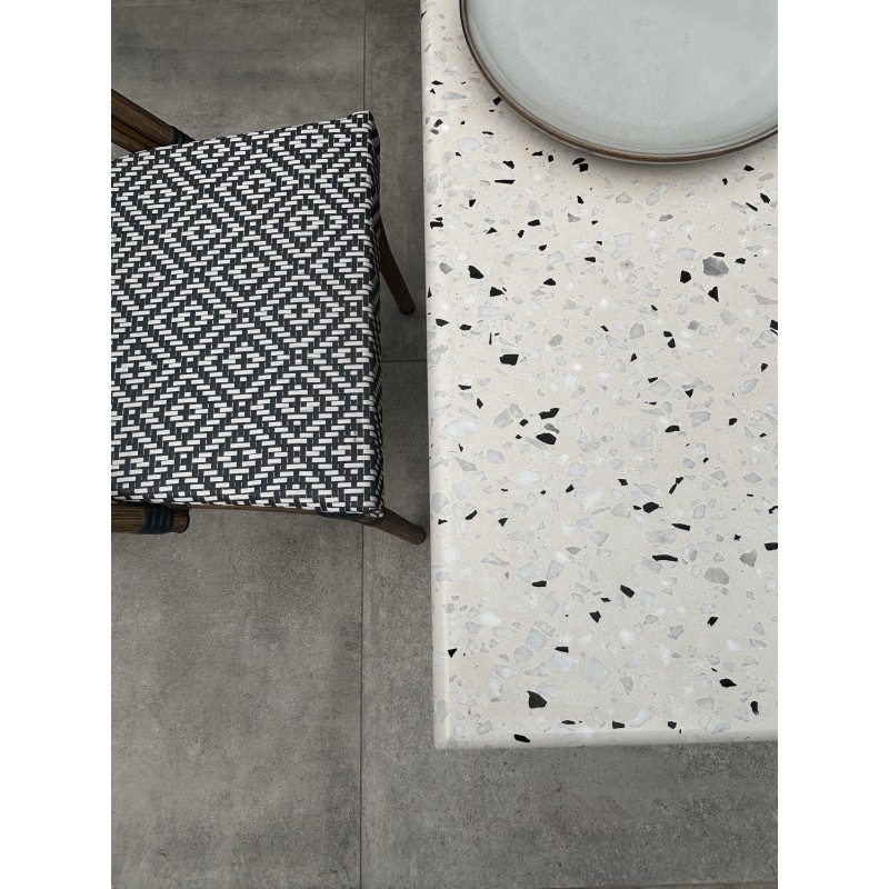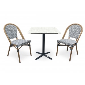 Idéale pour les petits espaces extérieurs comme pour accueillir des clients dans un restaurant, la table de jardin BISTRO en acier se glisse partout et accueille jusqu’à 2 personnes. Stable et robuste, elle mêle un style bistro chic qui vous charmera, grâce notamment à son élégant plateau en terrazzo.Élégant et résistant, le fauteuil de jardin BISTRO en aluminium aspect bois a un style totalement intemporel. A la fois léger et empilable, il est très pratique pour les terrasses extérieures. Son assise et son dossier en textilène sont très confortables.