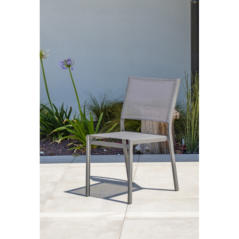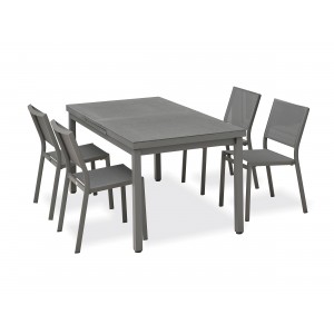 Equipée d’une rallonge automatique, la table de jardin DANIA en aluminium gris anthracite est surmontée d’un robuste plateau en spraystone. L’alliance de ces deux matériaux lui confère une allure authentique et élégante.Les chaises de jardin STOCKHOLM en textilène et aluminium gris anthracite sont empilables.