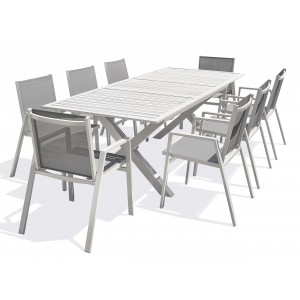 La table de jardin FLORIDE combine élégance et praticité, puisque sa rallonge automatique permet d’asseoir confortablement jusqu’à 10 convives. Ses pieds croisés lui confèrent également une touche industrielle très raffinée.A la fois sobre et tendance, le fauteuil de jardin FLORIDE est très confortable grâce à son assise et son dossier en textilène. Empilable, il permet un gain de place et facilite son stockage l’hiver.