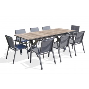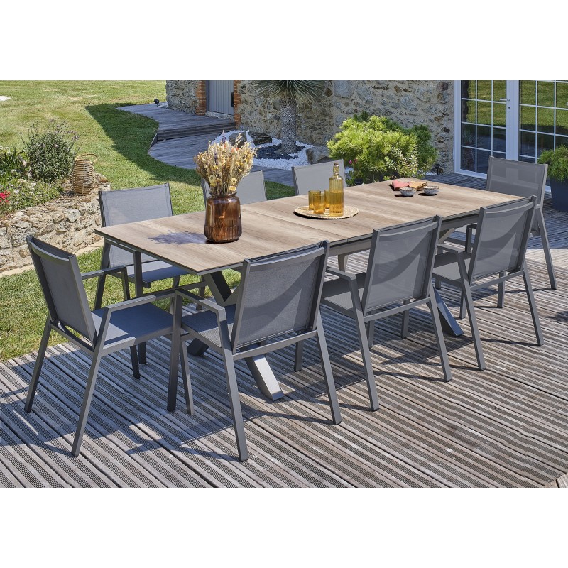 La table de jardin FLORIDE combine élégance et praticité, puisque sa rallonge automatique permet d’asseoir confortablement jusqu’à 10 convives. Ses pieds croisés lui confèrent également une touche industrielle très raffinée.A la fois sobre et tendance, le fauteuil de jardin FLORIDE est très confortable grâce à son assise et son dossier en textilène. Empilable, il permet un gain de place et facilite son stockage l’hiver.