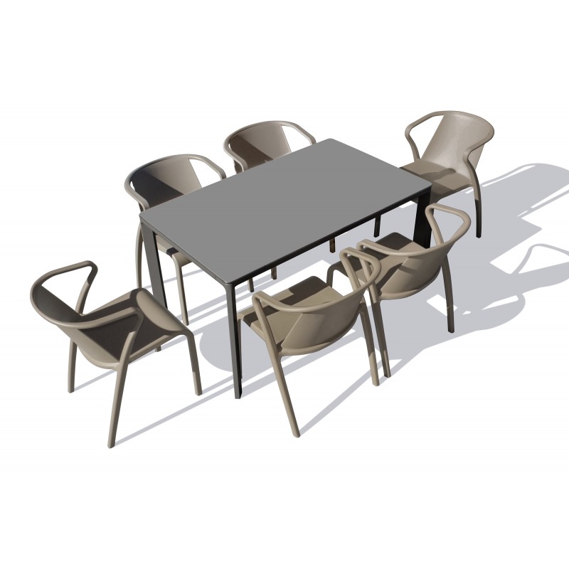 La table de jardin MEET 160x90 cm est empilable et embellira votre extérieur pour de nombreuses années. Elle est également solide et robuste grâce à sa structure en aluminium laqué avec peinture Epoxy, son plateau en stratifié compact de haute densité et ses assemblages en fonte d'aluminium.Le fauteuil de jardin FADO en polypropylène renforcé avec fibre de verre est léger, empilable et 100% recyclable. Il est également résistant aux chocs, au gel et aux UV. Son dossier incliné et ses accoudoirs au design moderne apporte un grand confort d'assise.