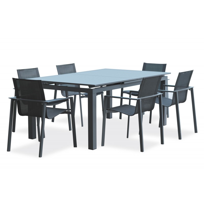 La table de jardin MIAMI 180/240x100cm vous permettra d'accueillir de 6 à 10 convives grâce à sa rallonge automatique facile à mettre en place.Les fauteuils de jardin MIAMI en textilène noir et aluminium gris anthracite sont empilables. Les lignes de la gamme MIAMI sont modernes, fluides et esthétiques.