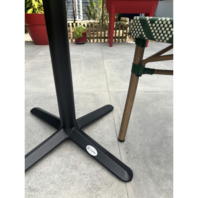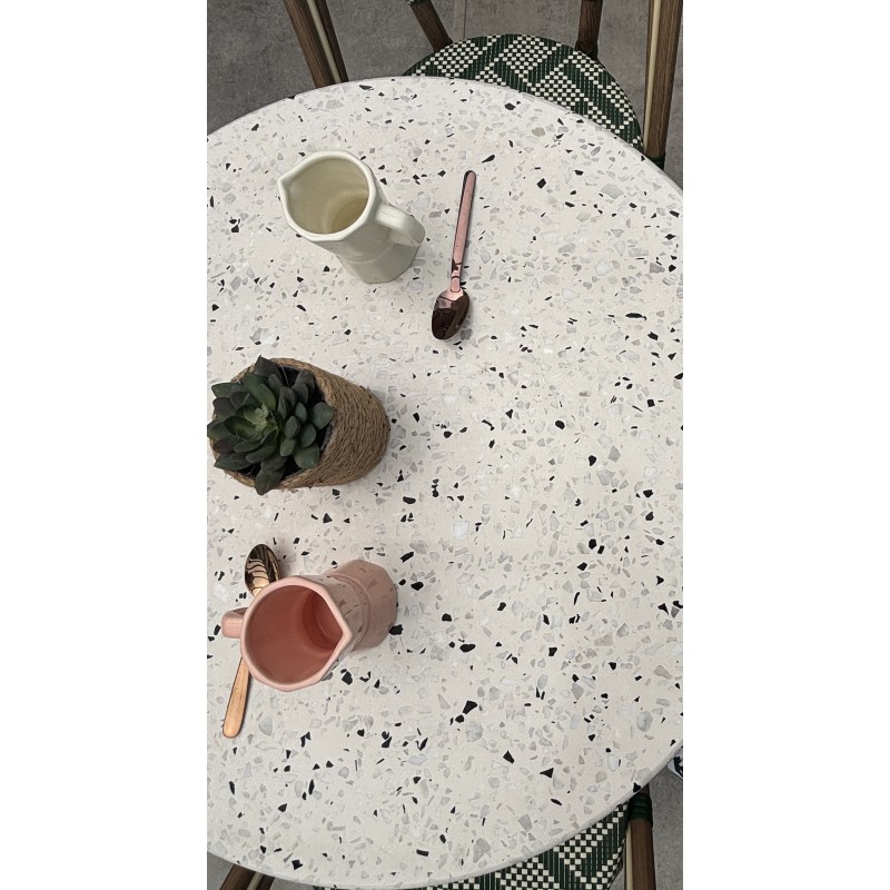 Idéale pour les petits espaces extérieurs comme pour accueillir des clients dans un restaurant, la table de jardin BISTRO en acier se glisse partout et accueille jusqu’à 2 personnes. Stable et robuste, elle mêle un style bistro chic qui vous charmera, grâce notamment à son élégant plateau en terrazzo.Élégant et résistant, le fauteuil de jardin BISTRO en aluminium aspect bois a un style totalement intemporel. A la fois léger et empilable, il est très pratique pour les terrasses extérieures. Son assise et son dossier en textilène sont très confortables.