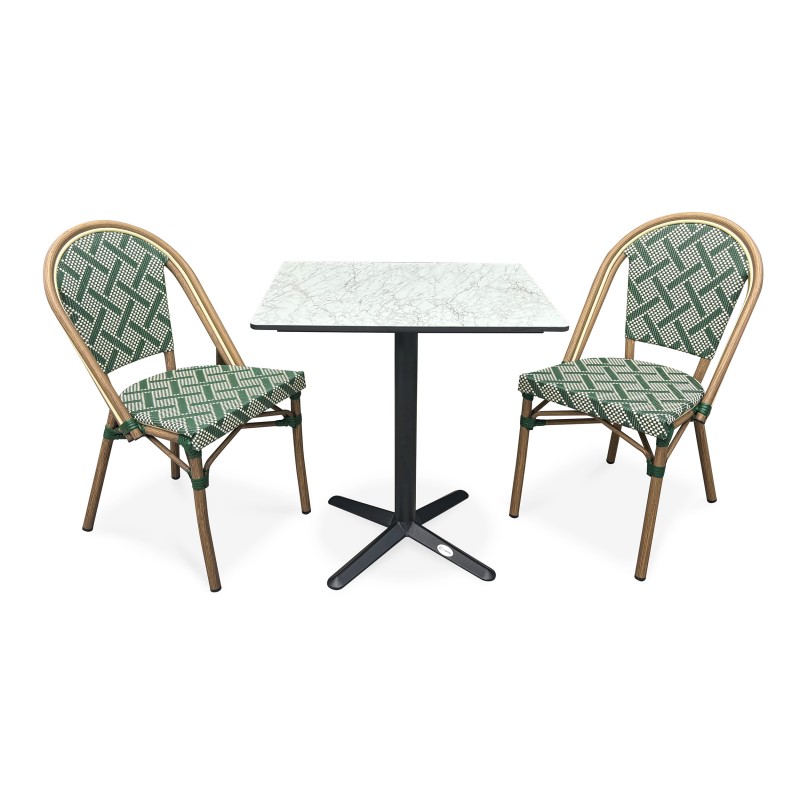 Idéale pour les petits espaces extérieurs comme pour accueillir des clients dans un restaurant, la table de jardin BISTRO en acier se glisse partout et accueille jusqu’à 2 personnes. Stable et robuste, elle mêle un style bistro chic qui vous charmera, grâce notamment à son élégant plateau en HPL aspect marbre blanc.Élégant et résistant, le fauteuil de jardin BISTRO en aluminium aspect bois a un style totalement intemporel. A la fois léger et empilable, il est très pratique pour les terrasses extérieures. Son assise et son dossier en textilène sont très confortables.