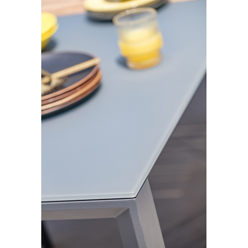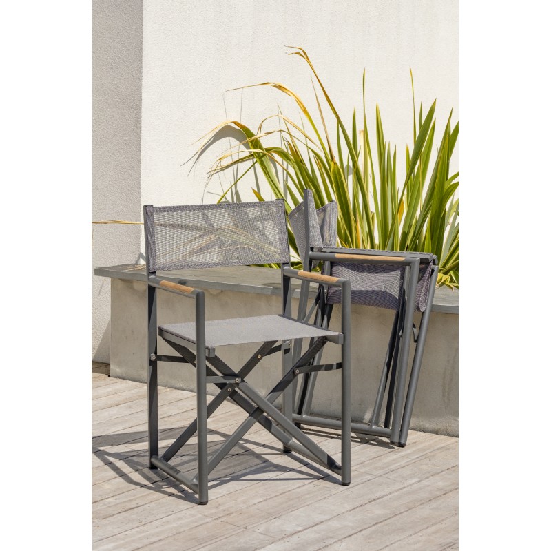 Son plateau en verre et sa rallonge manuelle en HPL imitation bois font de la table de jardin HONFLEUR une subtile alliance de matériaux pour un look très contemporain.Le fauteuil de jardin Director Chair HONFLEUR en aluminium gris anthracite signe son style original avec une incrustation en teck sur ses accoudoirs. Son textilène assorti à la structure lui confère un grand confort d’assise.