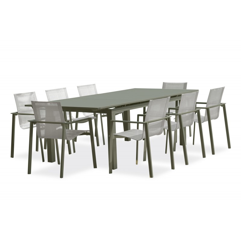 La table de jardin MIAMI 180/240x100 cm, en aluminium kaki, dispose d'une rallonge automatique facile à mettre en place. Les lignes de la table MIAMI sont modernes, fluides et esthétiques.Les fauteuils de jardin MIAMI en textilène gris et aluminium kaki sont empilables. Les lignes de la gamme MIAMI sont modernes, fluides et esthétiques.