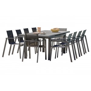 En aluminium gris anthracite, la table de jardin VENISE dispose d’un plateau en céramique aspect pierre naturelle. La rallonge automatique permet de passer rapidement de 8 à 10 convives en toute simplicité.Les fauteuils de jardin MIAMI en textilène noir et aluminium gris anthracite sont empilables.