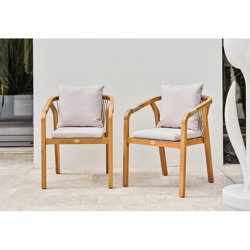 L’attention est attirée sur la corde tissée qui orne ces élégants fauteuils de jardin certifiés FSC® 100% en bois d'acacia, au rendu naturel et confortables grâce à leurs épais coussins de dossier et d’assise.Ensemble composé de : 2 fauteuils SERENA
