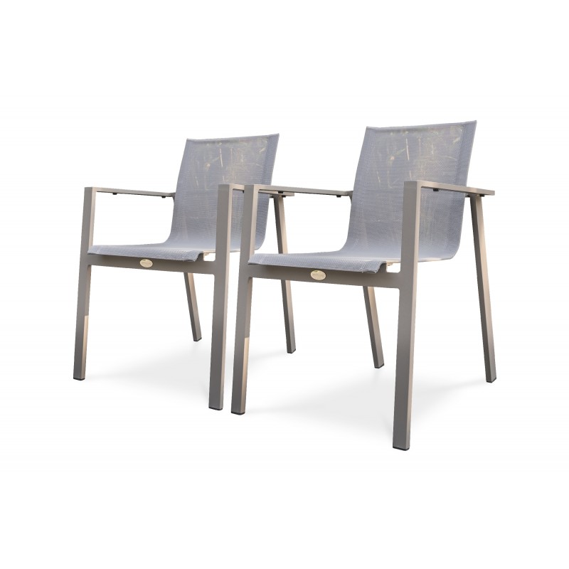 Le fauteuil de jardin ZAHARA en textilène et aluminium taupe est empilable. Les lignes de la gamme ZAHARA sont modernes, fluides et esthétiques.Lot composé de : 2 fauteuils ZAHARA