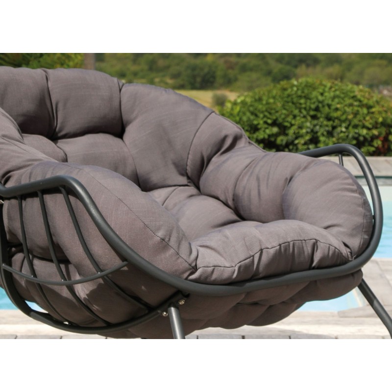 Sa structure en acier avec finition époxy lui assure solidité et durabilité. Son coussin en polyester bénéficie d’un traitement déperlant, permettant une utilisation en extérieur tout en offrant un confort optimal.