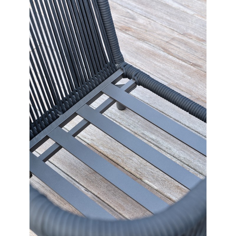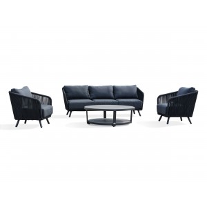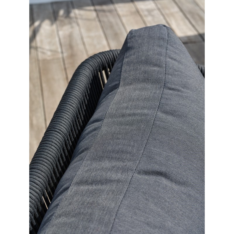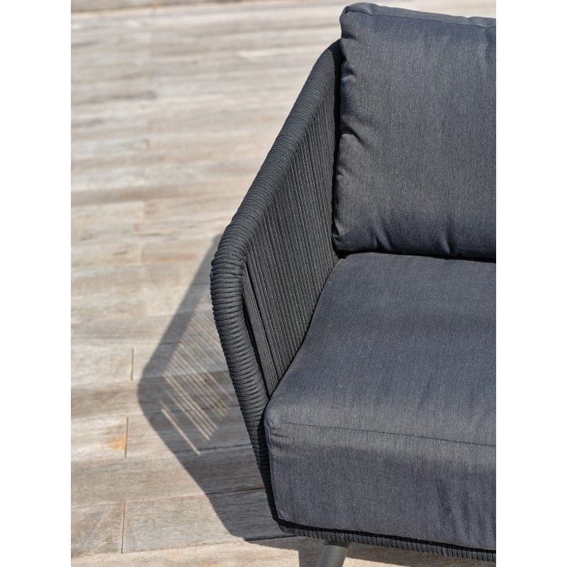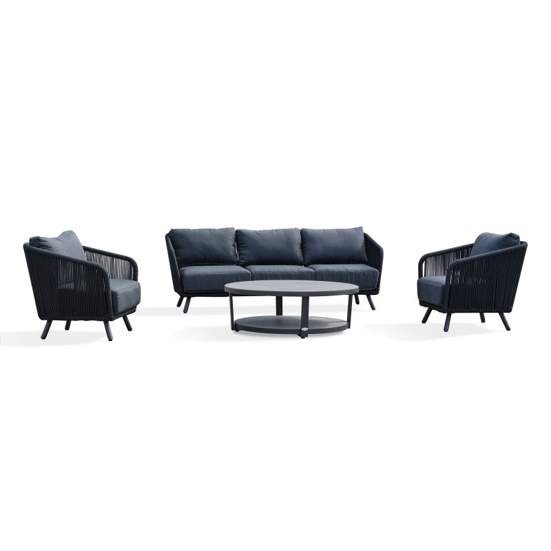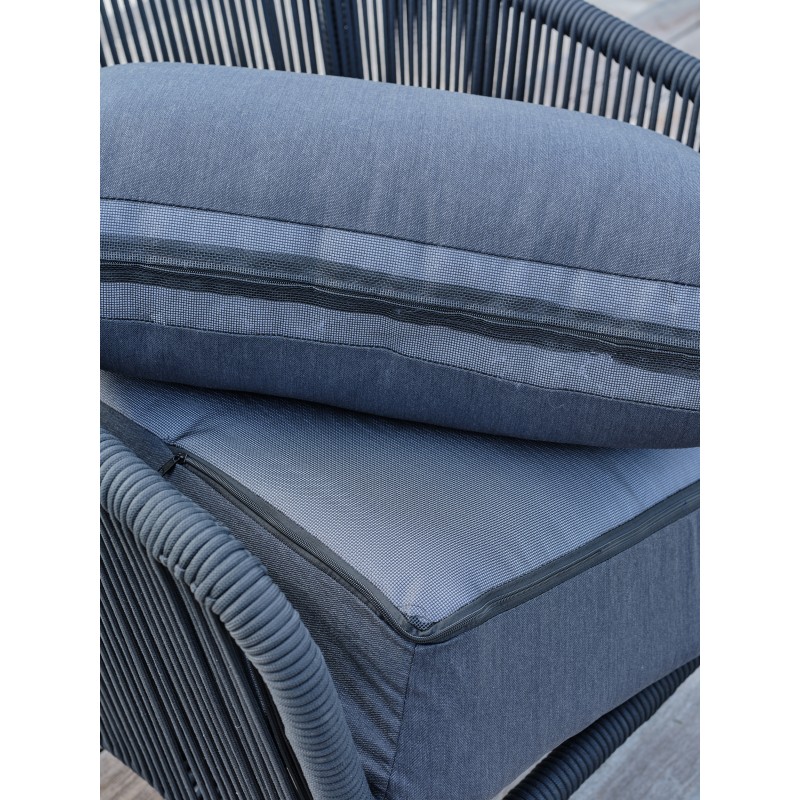 Avec ses formes arrondies toute en souplesse et sa corde tissée grise anthracite assortie à ses coussins, le salon de jardin BIARRITZ se distingue par son élégance et son aspect luxueux.Ensemble composé de : une table basse, un canapé 3 places, 2 fauteuils, 5 coussins d'assise et 5 coussins de dossier.
