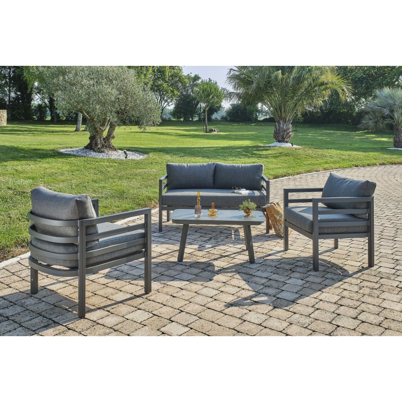 Avec son design tendance et ses formes rondes toutes en souplesse, le salon bas de jardin LISBONNE se distingue par son élégance.Ensemble composé de : un canapé 2 places, 2 fauteuils, une table basse, 3 coussins d'assises et 4 coussins de dossier. Tous les coussins sont déhoussables.