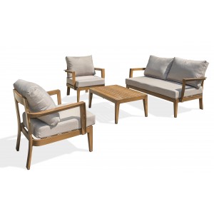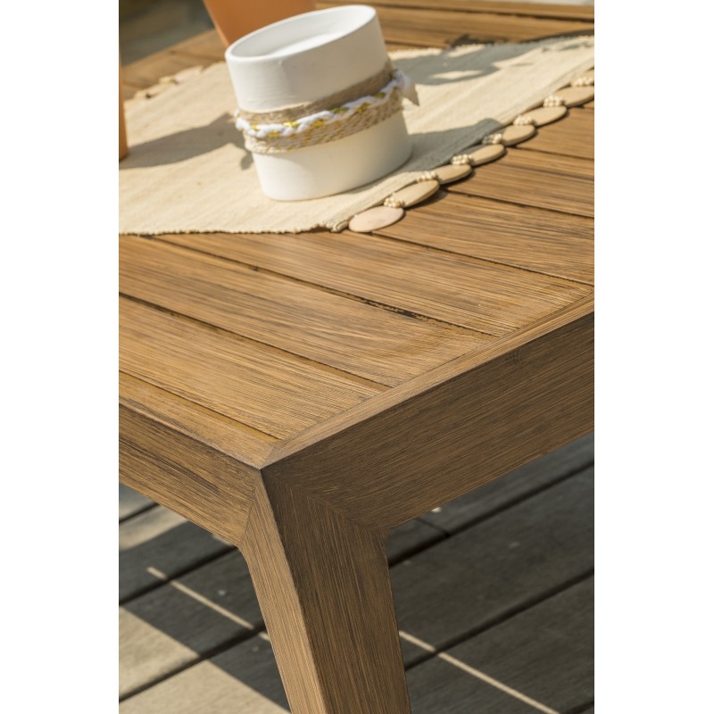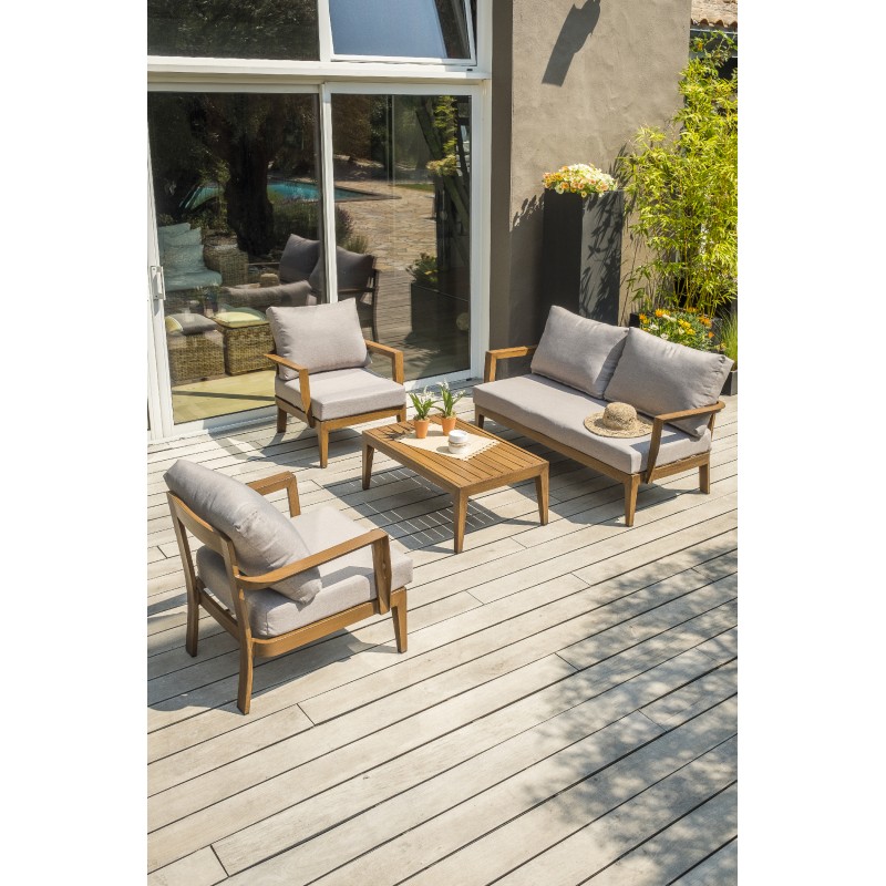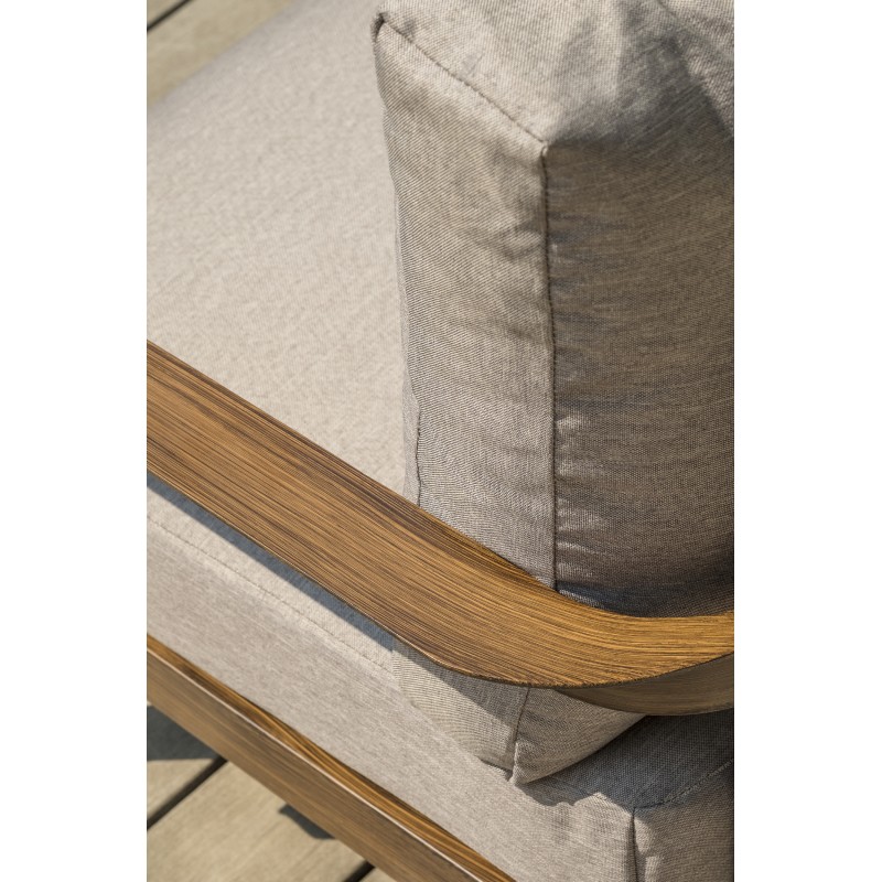 Sa structure en aluminium effet bois offre au salon bas de jardin PORTOFINO authenticité, robustesse et naturel.Ensemble composé de : une table basse, une banquette 2 places, 2 fauteuils, 3 coussins d'assise et 4 coussins de dossier. Tous les coussins sont déhoussables.