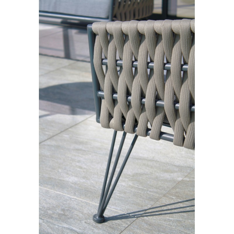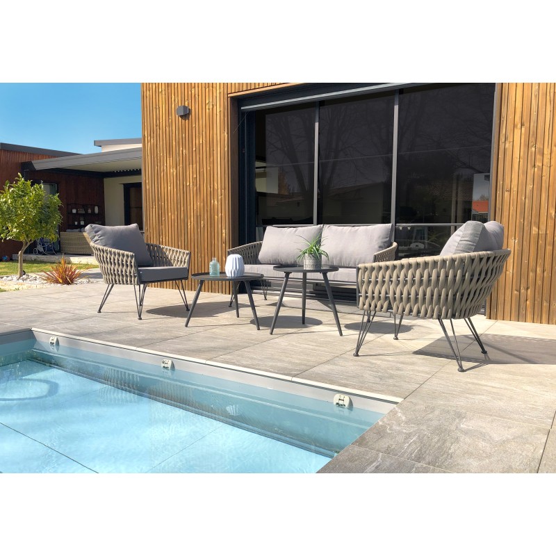 Ses lignes courbées et ses pieds élégants font du salon de jardin CAPRI une invitation à la détente et au partage. La structure est en corde tissée taupe et il est accompagné de deux tables gigognes.Ensemble composé de : un canapé 2 places, 2 fauteuils, 2 tables basses rondes, 3 coussins d'assise et 4 coussins de dossier. Tous les coussins sont déhoussables.