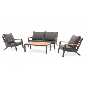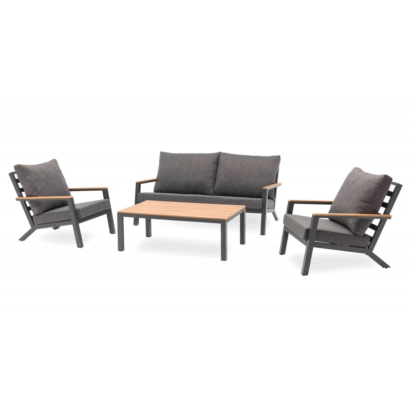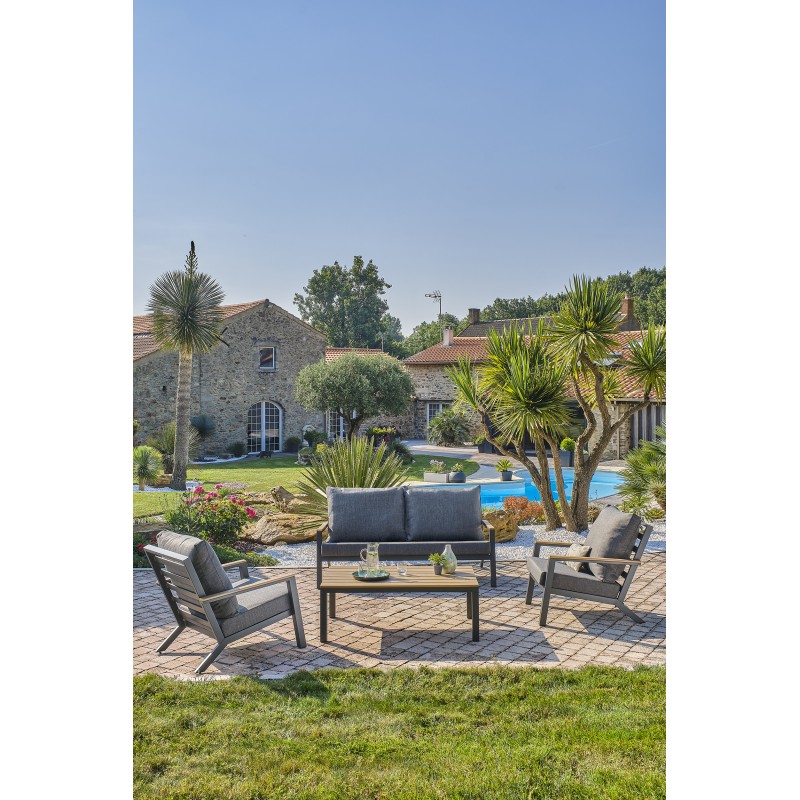 La table basse spacieuse du salon de jardin KOMMOS est un véritable atout de confort et de praticité.Son canapé et ses 2 fauteuils, dont les accoudoirs sont réhaussés de polywood, permettent de recevoir jusqu’à 5 invités, en toute convivialité.