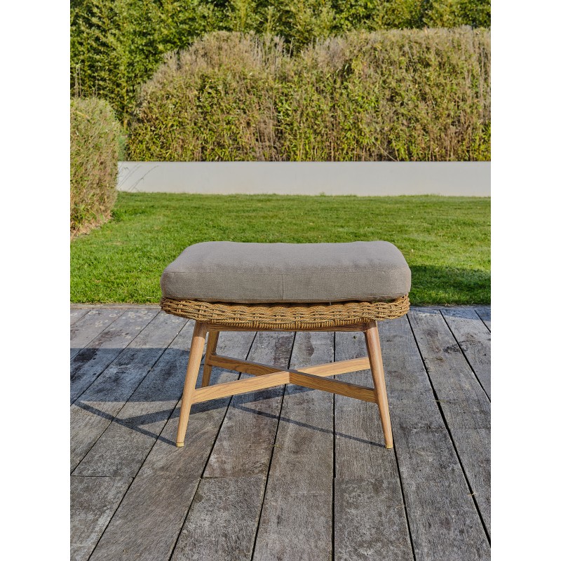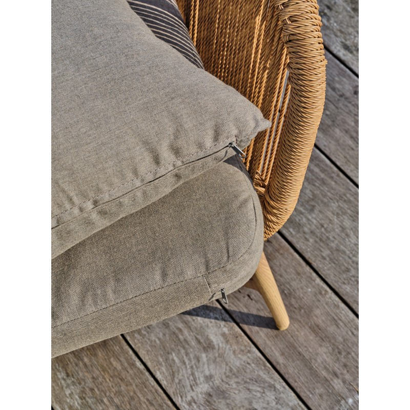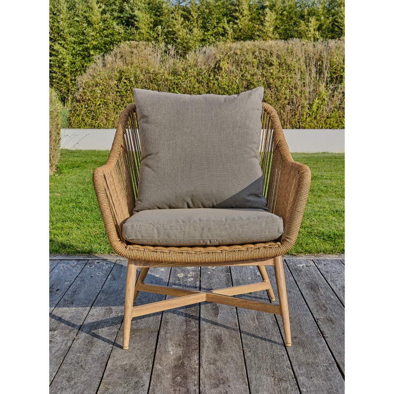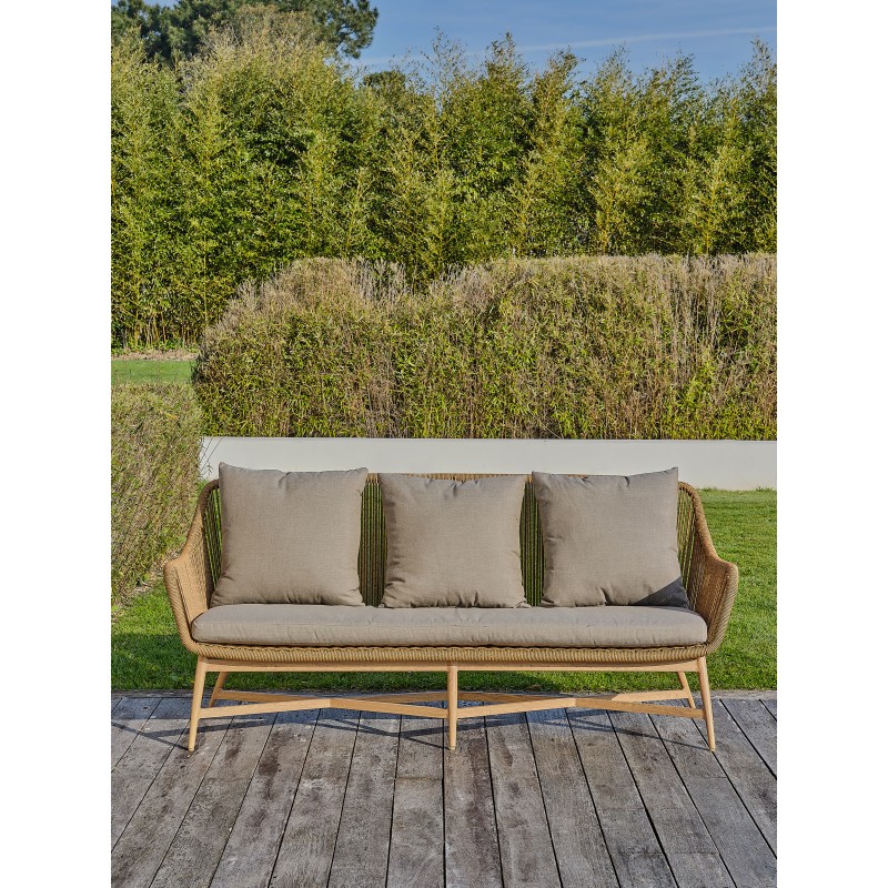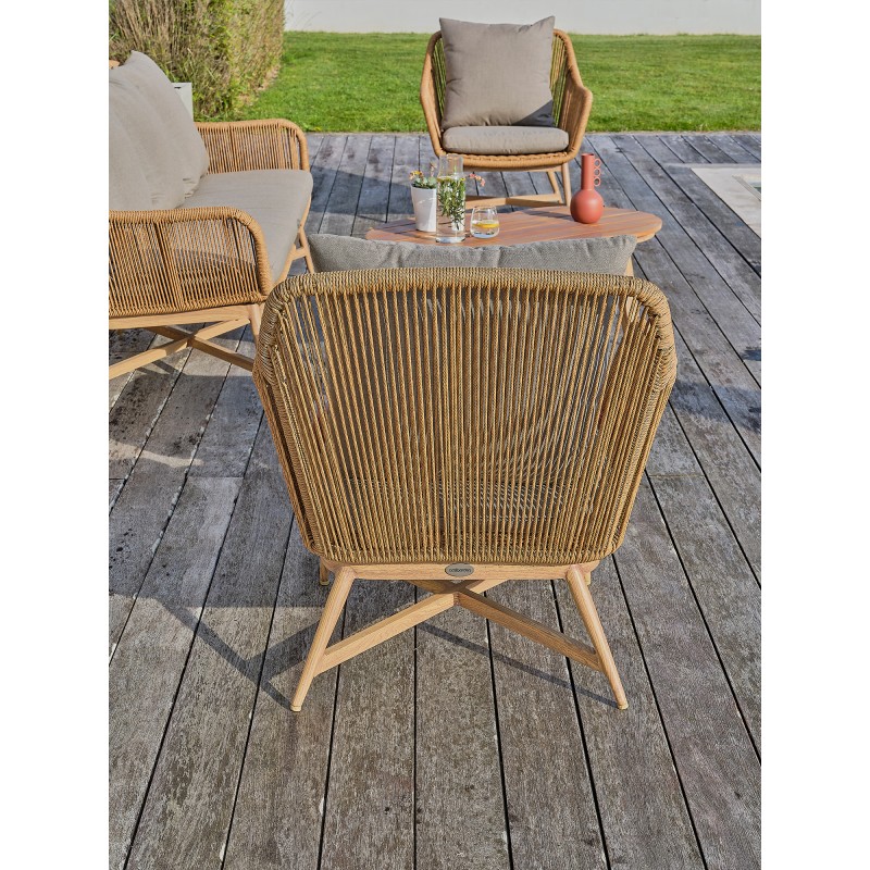 Le salon de jardin PALMAS en aluminium, teck et corde tissée aspect naturel est modulable à souhait. Il est agrémenté d’un repose-pieds qui peut également servir de pouf et ainsi accueillir un convive supplémentaire pour répondre à tous les besoins du moment.Ensemble composé de : 2 tables basses, 1 canapé 3 places, 2 fauteuils, un repose-pieds, 4 coussins d'assise et 5 coussins de dossier.