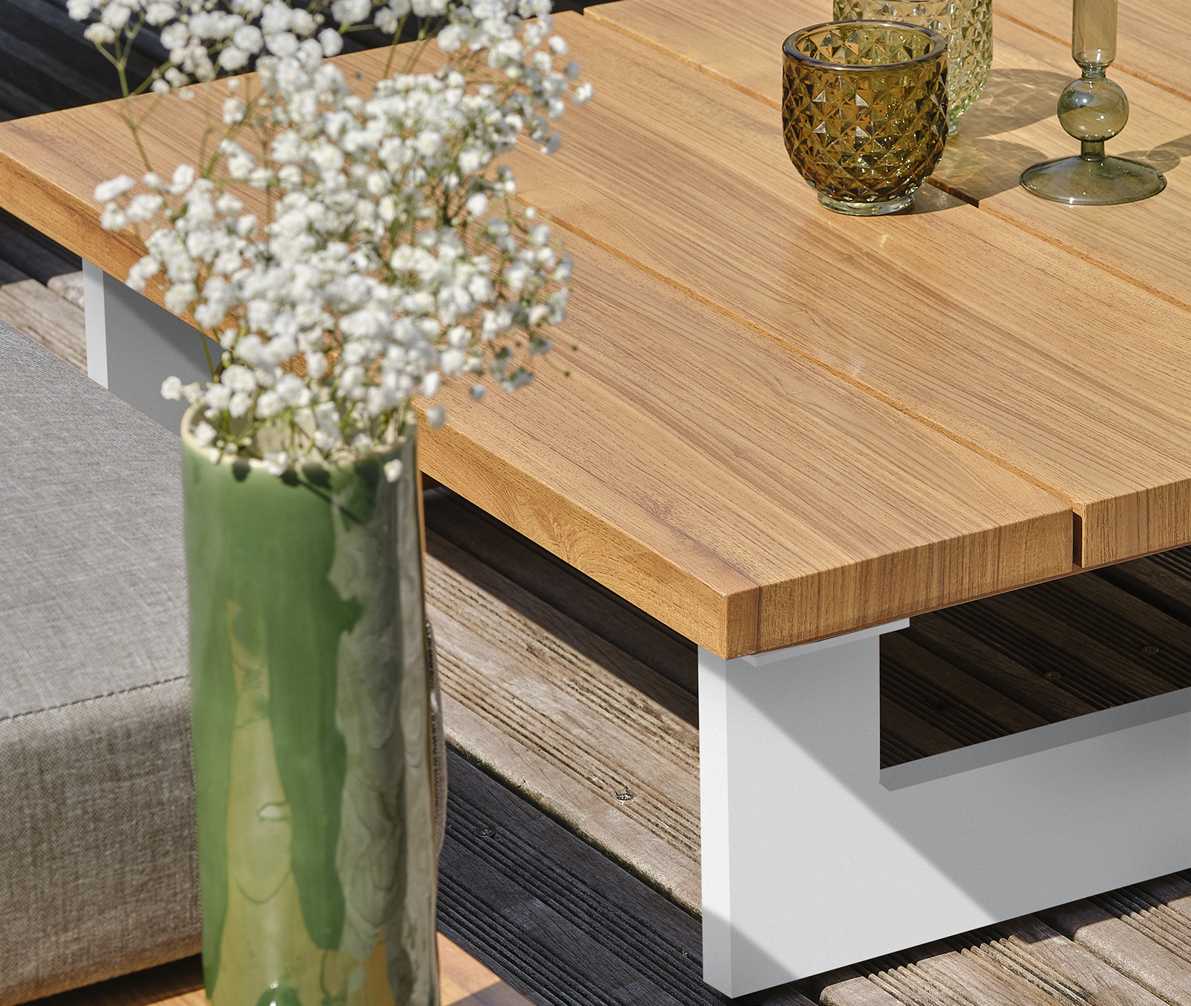 Les tablettes latérales en imitation bois ajoutent une touche d'élégance et de praticité à ce salon de jardin. Elles vous offrent un espace supplémentaire pour poser vos boissons, livres ou tout autre objet dont vous avez besoin à portée de main. De plus, le plateau de la table en imitation bois apporte une ambiance chaleureuse et naturelle à l'ensemble du mobilier, créant ainsi une atmosphère accueillante et charmante contrasté avec le blanc élégant de la structure.