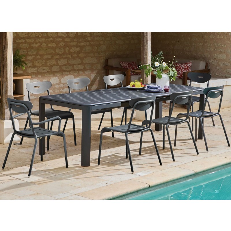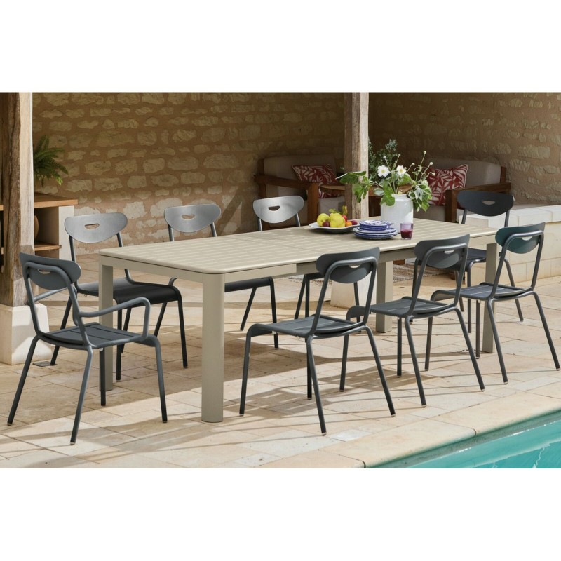 Conçue en aluminium avec finition époxy, elle offre légèreté et résistance, même en extérieur ou en bord de mer. Idéale pour une terrasse ou un jardin, elle permet de créer un espace repas convivial et moderne.
