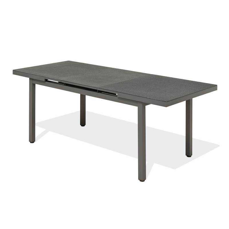 Equipée d’une rallonge automatique, la table de jardin DANIA en aluminium gris anthracite est surmontée d’un robuste plateau en spraystone. L’alliance de ces deux matériaux lui confère une allure authentique et élégante.