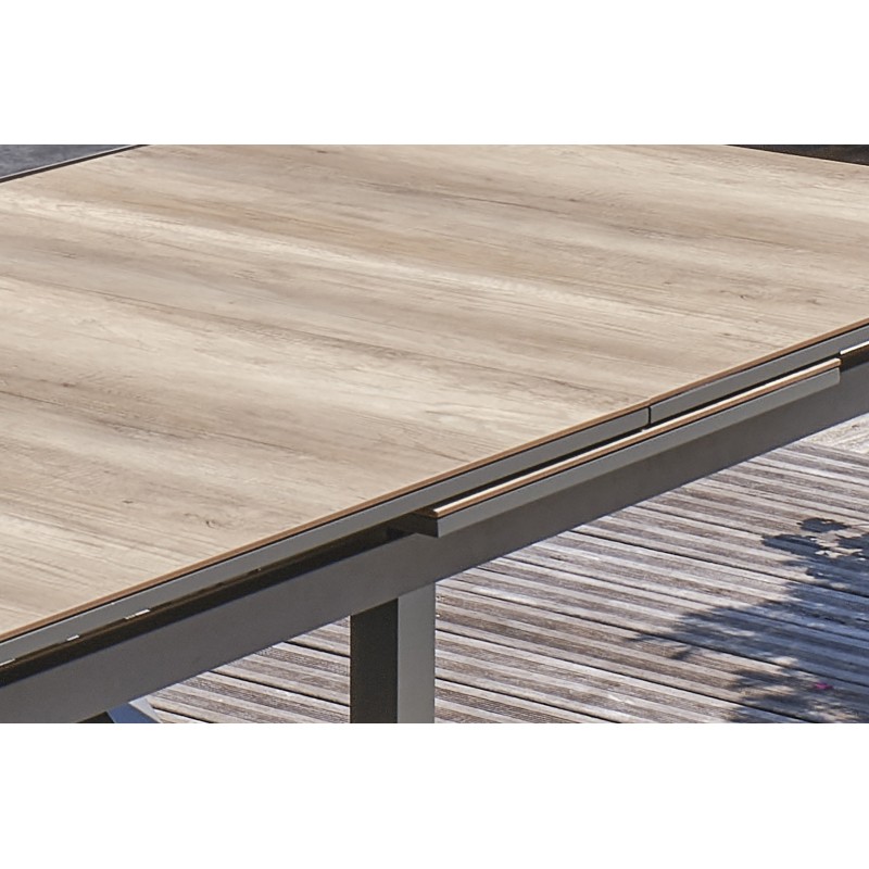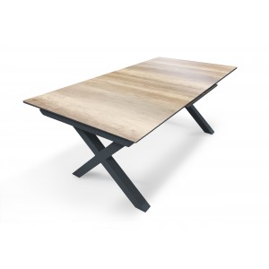 La table de jardin FLORIDE combine élégance et praticité, puisque sa rallonge automatique permet d’asseoir confortablement jusqu’à 10 convives. Ses pieds croisés lui confèrent également une touche industrielle très raffinée.