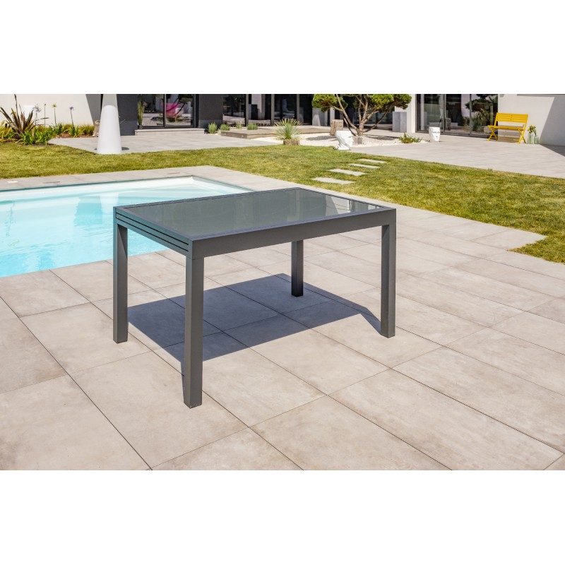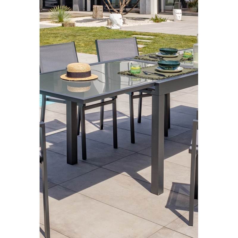La table de jardin TOLEDE est en aluminium gris anthracite. Son plateau en verre est équipé d’une rallonge astucieuse et discrète.